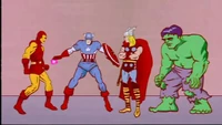 (Scene goes to title card "Avenger Time" with Hulk, Captain America and Thor holding a banner that says "With Cap, Thor, Hulk, & Iron Man". Iron Man flies through.)